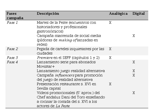 En el presente estudio, sobre la serie La Peste, se orquestó una campaña clásica en social media (gamificación, trending topics, entre otros) insertada en una campaña física (de experiencias gastronómicas y turísticas) que, junto con una mapeado 3D vectorial en app de smartphone (ARGs), buscaba recrear la experiencia histórica de ser y estar en la Sevilla del siglo XVI, en que se ambienta la serie (una ciudad de ultramar, de las más poderosas del mundo en su momento, abierta a América y, quizás por eso, una ciudad oscura, férreamente jerarquizada y corrupta). La segmentación de la campaña quedaría como se visualiza en el Cuadro 1.