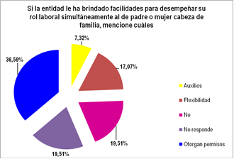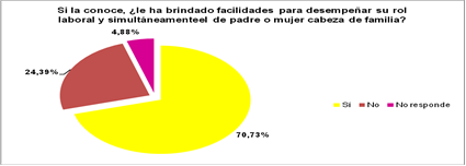 Conviene subrayar, que un alto porcentaje (46,34%) no ha informado oportunamente a su empleador, lo que les ha hecho perder su condijo frente a la administración pública. Por lo cual, se procedió a preguntarles a los sujetos de estudio si la entidad les da facilidades para desempeñarse como mujer cabeza de familia en el ámbito laboral y familiar, pregunta cuyas respuestas se representan en el Gráfico IV.