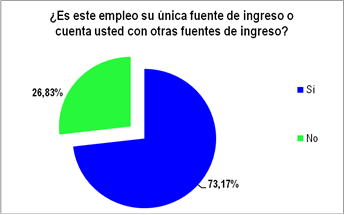 En este orden de ideas, el estudio arrojó que en su mayoría las facilidades ofrecidas por las alcaldías, para el ejercicio del rol de cabeza de familia de sus funcionarios, se traducían en un 17,07% para flexibilidad horaria y un 36,59% relacionado a permisos para atender sus obligaciones de jefe del hogar; de este modo lo anterior debe ser tenido en cuenta a grado de suma importancia, pues dentro de este estudio se logró establecer que el 73,17% de las personas cabeza de familia encuestadas, tienen solo un empleo como única fuente de ingreso (ver Gráfico VI) para poder financiar a sus alimentarios.