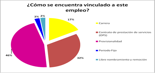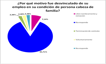 Teniendo en cuenta el anterior enunciado, se tiene que al indagar con los encuestados sobre los motivos por los cuales fueron desvinculados en caso de serlo, estos manifestaron, en su mayoría que tal desvinculación obedeció al tipo de convenio con la entidad, es decir, que los empleados que fueron vinculados bajo la figura del libre nombramiento y remoción, fueron quienes presentaron mayor tendencia a la desvinculación, así, como se aprecia en el Gráfico X.