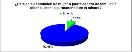 Ahora bien, en cuanto a las Alcaldías objeto de estudio, sucede que respetan de manera imperativa la condición que, de cabeza de familia tengan sus funcionarios, de tal suerte que al indagar si su condición de mujer o padre cabeza de familia ha sido un obstáculo en la permanencia del cargo que ha venido desempeñando sobre el particular indicaron en un 92,68% que no, tal como se aprecia en el Gráfico VIII.