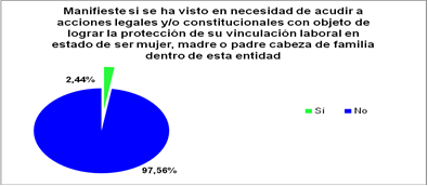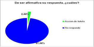 Teniendo en cuenta la sentencia, se preguntó a los encuestados si se habían visto en necesidad de acudir a acciones legales y/o constitucionales, con el fin de proteger su vinculación laboral con la respectiva alcaldía para la cual laboraban, obteniendo por resultado que solo el 2,44% de la población estuvo en tal situación tal como se muestra en el Gráfico XI.