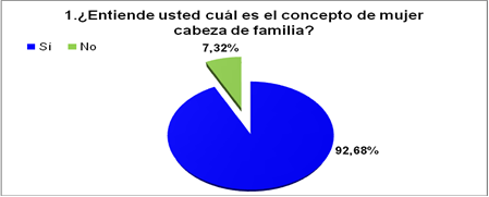 Se tomaron muestras intencionales en cinco Alcaldías del Departamento del Atlántico, compuestas de trabajadores madres cabeza de familia y sus jefes de personal. Las participantes fueron de: Barranquilla, Soledad, Puerto Colombia, Malambo y Galapa. Teniendo en cuenta los resultados obtenidos mediante los instrumentos aplicados, tales como: Encuestas y entrevistas; se empleó el uso del concepto “mujer cabeza de familia”, de tal forma que los resultados indicaron que el 92,68% de personas encuestadas tenían claro tal concepto, y como lo muestra el Gráfico I, solo el 7,32% aludían desconocerlo.
