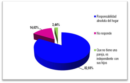En consecuencia, lo determinante para establecer el estado de cabeza de familia, es el hecho de tener a cargo personas que dependan económicamente de ella, quiere decir esto, que además será cabeza de familia sin importar el tipo de vínculo que tenga con sus protegidos. De esta manera, al preguntárseles a las personas del estudio cómo asocian o comprenden el concepto de mujer cabeza de familia, el 82,93% de los encuestados asociaban correctamente el concepto de mujer cabeza de familia con la manutención exclusiva del hogar por parte de una persona. Ocurrió también que un 2,44% de los encuestados lo asoció con su estado civil, del modo en que a continuación se muestra en el Gráfico II.