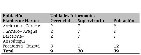 Por otra parte, este estudio se consideró de campo (Bavaresco, 2007), debido a que los hechos estudiados no fueron aislados de su contexto, es decir, se copilaron los datos en el ambiente de las empresas estudiadas. La población sobre la cual se centró el estudio (Hernández, et al., 2014), estuvo conformada por las mediciones u observaciones del personal del nivel gerencial, supervisorio en las plantas de harina; que labora en las ciudades de Caracas, Turmero y Barcelona en Venezuela, así como en Facatativá en Colombia, los cuales están distribuidos en el universo conformado por 4 plantas. En este sentido, las unidades informantes fueron 39 personas con cargos directivos en dichas plantas, siendo 9 gerentes y 30 supervisores.