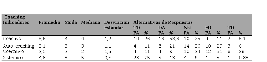 Aunado a ello, los datos de medida de tendencia central y de dispersión indicaron un promedio de 3,1, destacando una categoría media en el rango de 4. De igual manera, la moda y la mediana, asumieron un valor de 3 cada uno de ellos; finalmente, la desviación estándar se ubicó en 1,1, ponderando un rango muy bajo de dispersión con respecto al promedio. Con base a esto, queda establecido que los directivos encuestados presentan consistencia en sus respuestas al manifestar que no implementan el coaching coactivo para fortalecerse en alcanzar las metas organizacionales y personales, ni para adecuar racionalmente los recursos utilizados, dentro del tiempo previsto en la planeación.