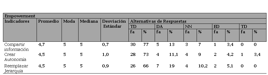 Continuando con los resultados y discusión, la Tabla 3 muestra los datos producto de la aplicación del instrumento; incluye tres indicadores del Empowerment como herramienta gerencial, el primero, referido a compartir información, se observa que 77% de la población manifestó estar totalmente de acuerdo, cuando se le preguntó, si en la empresa es común que la información sea compartida entre gerentes, supervisores y empleados; pues en el diseño de un plan, se toma en cuenta la opinión de los participantes del proceso, la estrategia es diseñada en forma intencional, para el logro de metas.