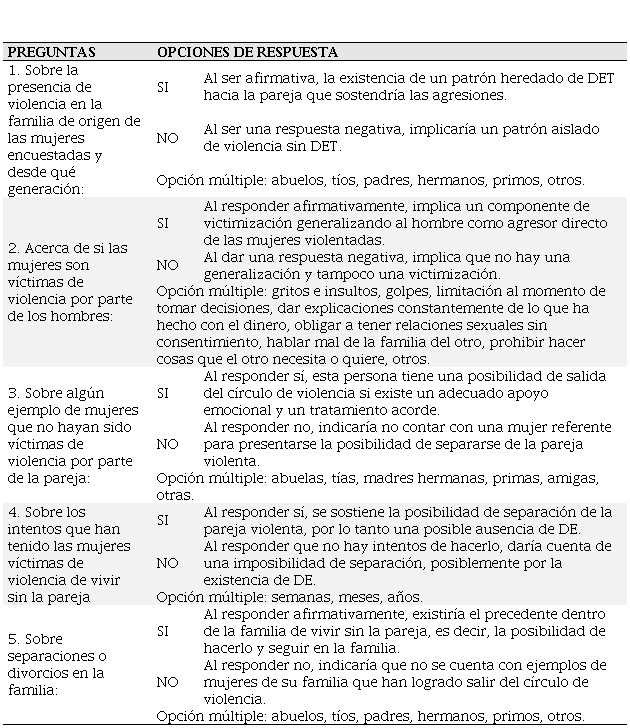 Se utilizaron los siguientes criterios de inclusión para las participantes: (1) Estar en los grupos de apoyo de la fundación o de los centros de salud mencionados (Riobamba y Quito); (2) ser mujer y percibirse como víctima de violencia; y, (3) estar separada de la pareja violenta. Luego de la revisión de la literatura científica del tema, el equipo de investigación creó un set de preguntas (ver Cuadro 1), de las cuales, cinco, de opción múltiple, corresponden a los resultados presentados.