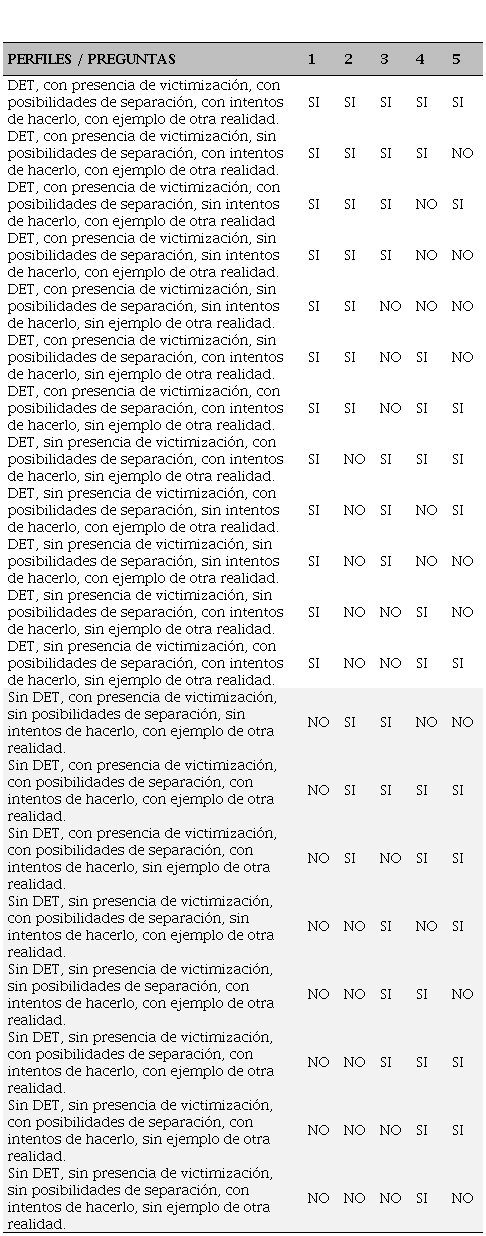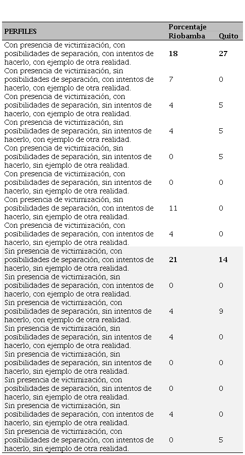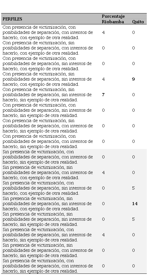 En lo que concierne a los perfiles propuestos (ver Cuadro 3 y 4), en la muestra de la ciudad de Quito, se observa que el perfil de mayor porcentaje denominado “DET, con presencia de victimización, con posibilidades de separación, con intentos de hacerlo, con ejemplo de otra realidad” alcanzó un 27%, seguido de los perfiles: “DET, sin presencia de victimización, con posibilidades de separación, con intentos de hacerlo, sin ejemplo de otra realidad” y “Sin DET, sin presencia de victimización, con posibilidades de separación, con intentos de hacerlo, con ejemplo de otra realidad” con 14% cada uno.