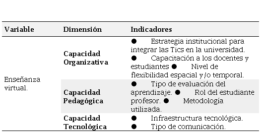 Las capacidades organizativas se asocian con lo procedimental y lo requerido para llevar a cabo lo planificado, representan habilidades para mantener un orden lógico y secuencial durante el proceso de aprendizaje. Mientras que, desde el plano tecnológico, las tecnologías permiten a los colaboradores generar entornos de interrelación en paralelo a los procesos de asociación cognitiva, representan capacidades vitales para convivir en espacios virtuales aportando en el crecimiento socio-digital (Holguin-Alvarez et al. 2021). De esta manera se obtienen dimensiones, indicadores con respecto a la enseñanza virtual, tal como muestra el Cuadro 1