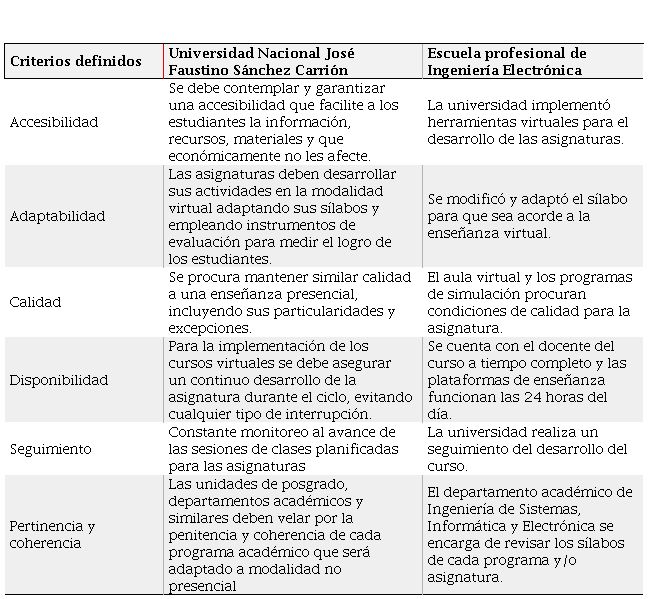 Según plantea Mariciniak (2016), el diseño de un proyecto de curso virtual debe cumplir con una organización y planificación adecuada que comprenda un conjunto de actividades, subfases, fases y tareas, que fomenten el desarrollo para un aprendizaje virtual. Por ello, es imprescindible elaborar un plan donde se definan acciones, recursos, actividades y objetivos debidamente precisados durante el desarrollo temporal. En ese sentido, los criterios establecidos por la Universidad Nacional José Faustino Sánchez Carrión para implementar un curso de pregrado bajo la modalidad virtual durante la pandemia de la covid-19, han sido los siguientes, tal como se muestran en el Cuadro 2.