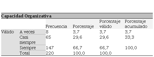 En esta dimensión comprendida por los ítems del 1 al 5, en la Tabla 1, se muestran resultados ubicados en tres alternativas de respuestas (a veces, casi siempre y siempre) que generan frecuencias y porcentajes. Al respecto, el 3,7% de los estudiantes encuestados cree que a veces se cumplió con la capacidad organizativa; el 29,6 % de estudiantes piensa que fue casi siempre y un 66,7% de estudiantes afirma que siempre se cumplió con esta capacidad.