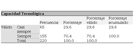 Esta dimensión comprendida por los ítems del 11 al 15, muestra resultados que indican que se tomó por válido dos categorías (casi siempre y siempre) donde se ubican las frecuencias y porcentajes. La Tabla 3, muestra que el 29,6% de estudiantes encuestados cree que casi siempre se cumplió con la capacidad tecnológica mientras que el 70,4 % de estudiantes afirma que siempre se cumplió con esta capacidad.