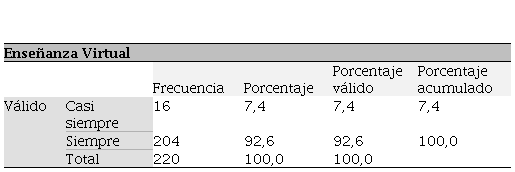 Variable que contiene todos los ítems del instrumento, los resultados indican que se tomó por válido dos categorías (casi siempre y siempre) donde se ubican las frecuencias y porcentajes. La Tabla 4, muestra que el 7,4% de estudiantes encuestados cree que casi siempre se cumplió, mientras que un 70,4 % de estudiantes afirman que siempre se cumplió con la enseñanza virtual.