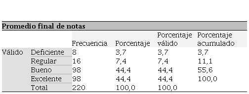 Con respecto al promedio final de notas en la Tabla 5, se visualiza que 212 estudiantes aprobaron la asignatura y 8 estudiantes desaprobaron, representando el 96,3% y 3,7% respectivamente. En la columna de la frecuencia se tiene que 98 de los alumnos que aprobaron, presentan un rendimiento en la escala de Likert excelente, otros 98 estudiantes un rendimiento bueno, 16 estudiantes con un rendimiento de regular y 8 estudiantes con rendimiento deficiente.