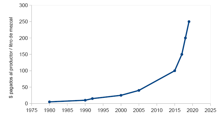 En la región miahuateca, durante la última década, se ha dado un incremento constante de los precios pagados al productor por litro de mezcal. Este hecho se ha dado aún a pesar que la mayor parte de los productores locales no forman parte de los productores certificados por el consejo regulador del mezcal y, por lo tanto, la mayor proporción de mezcaleros locales quedan fuera de la posibilidad de acceder a mercados de exportación o mercados nacionales formales. El incremento de los precios ha sido de especial importancia durante los últimos cinco años (ver Gráfico I).
