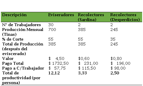 En la productividad en función del salario para eviscerado y recolectores, el pago a cada trabajador, va a depender del número de tinas que recolecten, el cual, puede variar de pesca en pesca; en este caso, se considera una producción de 700 tinas, en donde, en la parte de corte solo el 55% de la extracción de la pinchagua es válido para su producción, donde se lleva a las fábricas, pasa por un proceso de producción adecuado, para su posterior comercialización, como se visualiza en la Tabla 9.