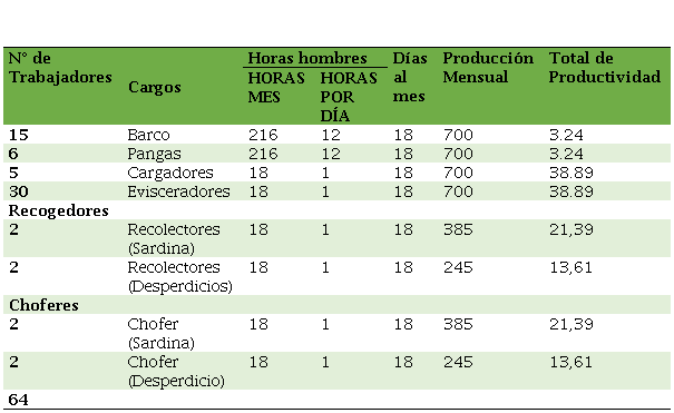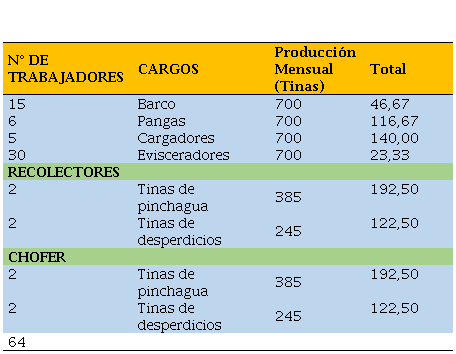 Se conoce que las unidades producidas en este caso son de alrededor de 700 tinas que son equivalente a 1 barco, cantidad que puede variar. Es necesaria la utilización de aproximadamente 64 personas, correspondiente a insumos empleados, los cuales se dedican a los diferentes roles de trabajo en esta actividad productiva de la pinchagua, tal como se aprecia en la Tabla 6.