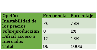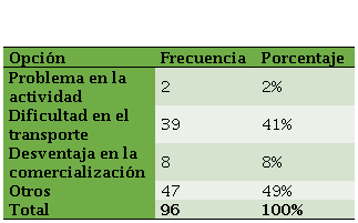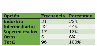 En la Tabla 1, se muestra que alrededor del 44% del total de los encuestados, indican que el destino de sus productos son los intermediarios, puesto que así se evitan tramites que retrasan o impiden el adecuado proceso de su producto como es el caso de la pinchagua. Existe una pequeña proporción que representa el 6% del total de los encuestados, que manifiesta que son otros los destinos, aquellos que no fueron proporcionados por ser confidencial por parte de ellos.