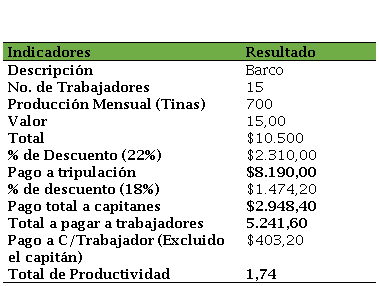 A continuación, se presenta el desarrollo de varias tablas, en donde se visualiza el nivel de productividad, con respecto a los barcos, pangueros, cargadores, eviseradores, recolectores, choferes, y otros gastos, aquellas que representan un nivel variado de la misma. De acuerdo a la productividad en función al salario, se consideran los valores de las unidades producidas con el salario mensual, obteniendo como resultado que el pago de cada trabajador, excluido el capitán, es de $ 403,20 por cada extracción de la pinchagua, que son equivalente a 700 tinas de pinchagua, como se visualiza en la Tabla 7.