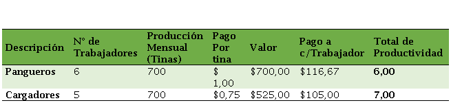 Con respecto a la productividad en función del salario de los pangueros y cargadores, el pago por tina es de $ 1,00 por una producción de 700 tinas, correspondiente al pago a cada trabajador de la panga de $ 116,67; no obstante, en los cargadores el pago por tina es de $ 0,75 ctvs, por una producción de la misma cantidad de tinas, correspondiendo al pago a cada trabajador en el proceso de carga de la pinchagua de $ 105,00, el cual, se visualiza en la Tabla 8.