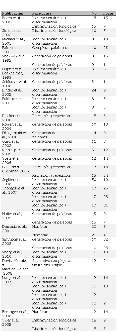 Por medio de una resonancia magnética, se determinaron las áreas involucradas en el proceso del lenguaje, en la que se identifica, por medio de diferentes mapas, la activación cerebral (Geyer et al., 2011). Este punto es considerado importante, puesto que el presente estudio tiene como objetivo entender e interpretar cómo se activan las áreas del cerebro, y por este medio, conocer los procesos neurocognitivos que involucran los paradigmas. Desde el punto de vista de la Neurociencia, se investigó las áreas de activación cerebral que están involucradas en el proceso del lenguaje por medio de paradigmas en la asignación de tareas, punto que se ampliará en los resultados.