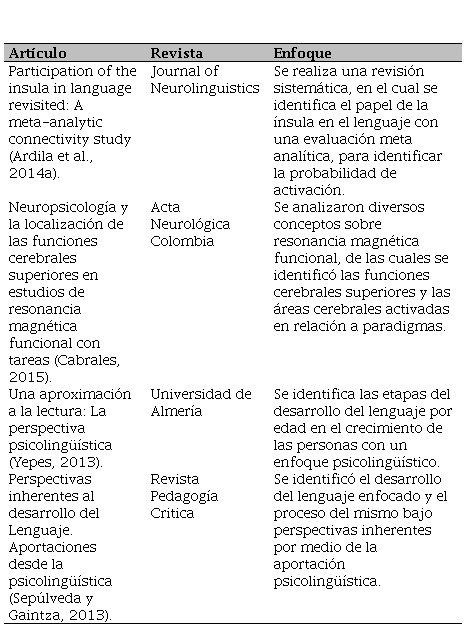 El abordaje o la construcción del diseño de investigación fue de teoría fundamentada, dado que se utiliza para preguntas sobre procesos y relación entre conceptos (Estrada-Acuña, Arzuaga y Giraldo, 2019); en este caso, para entender, cómo el cerebro procesa el lenguaje, desde la Neurociencia y la Psicolingüística, se indagaron documentos de alto impacto que sirvieron como instrumentos, los cuales se usaron de una forma no pasiva para estudiarlos y analizarlos en cualquier momento (ver Cuadro 3). Incluso, para analizar las áreas que se activan en el cerebro cuando la persona empieza a activar el lenguaje.