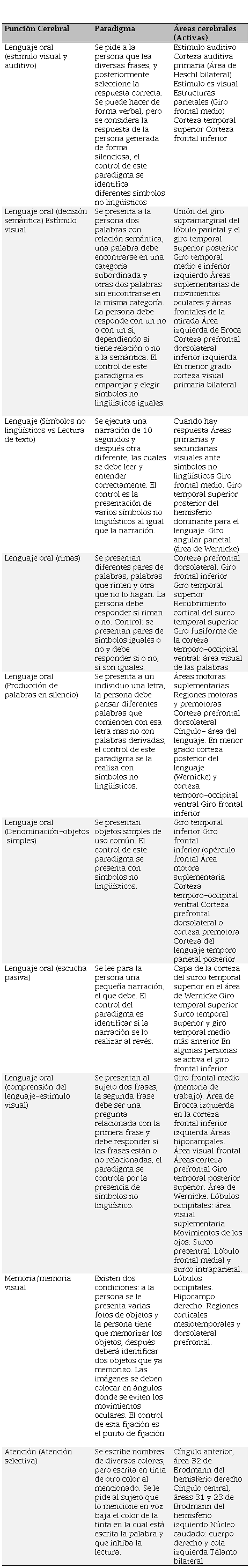 Segundo, durante el reposo en los paradigmas se pueden activar una serie de regiones en las áreas de Brodmann. Tercero, se debe considerar el hecho que, aunque un área se active no es indispensable para esa tarea en cuestión. Cuarto, inversamente el hecho que no se activen ciertas áreas esperadas durante la ejecución de una tarea, no indica presumir que no participan en el proceso, es posible que participen, pero puede ser que la resonancia magnética que captura la actividad cerebral no haya alcanzado a captarlo (véase el Cuadro 2).