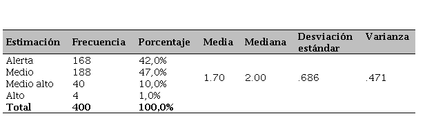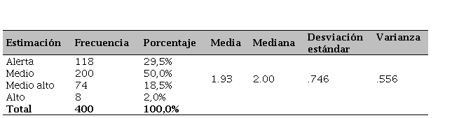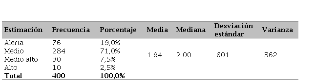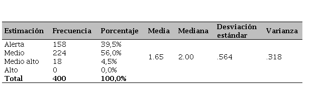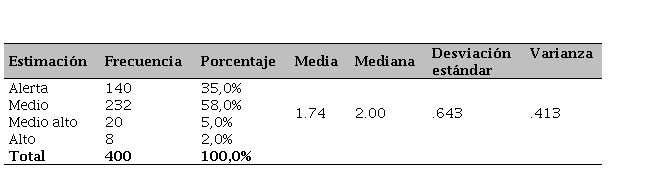 Se observa que en los estudiantes de educación inicial cerca de tres cuartos de la población (61%) mantiene un desarrollo medio de la habilidad (ver Tabla 7); mientras que, por encima de un cuarto de la población se encuentra en la estimación de alerta. Por otra parte, aproximadamente, la mitad de un cuarto de la muestra (7,5%) de la investigación mantiene un desarrollo medio alto, asimismo, se observa que una mínima parte de escolares evaluados mantiene un nivel alto (1%) dentro de la evaluación realizada. Las frecuencias demuestran que, a pesar de ser de un nivel superior a los resultados anteriores, la motricidad es el eje central que permite evaluar el alcance y el direccionamiento de los programas.