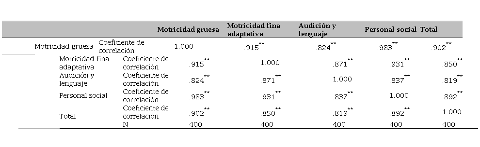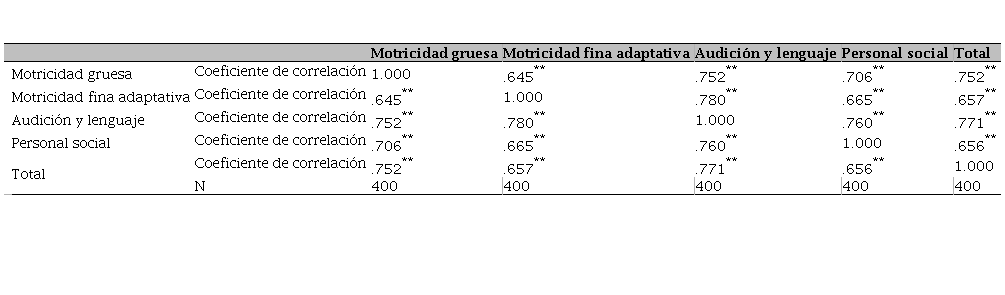 Por otra parte, entre la variable audición y lenguaje, en conjunto con la variable relacionada con la motricidad gruesa, también tiene una correlación positiva (.752). La variable personal social y motricidad (.665); no existiendo ningún tipo de distanciamiento, más bien, observándose consistencia en los resultados, lo que permite indagar que el instrumento fue empleado de manera correcta.