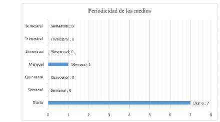 De otra parte, como se observa en el Gráfico VI, los medios tienen un 98% de periodicidad diaria, dados los formatos que así lo exigen. En algunas emisoras la continuidad es de 16 horas, aunque en otros casos 24 horas, los 7 días a la semana. Varios medios se encuentran trabajando con Tecnologías de Información y Comunicación (TIC) para auto programar su parrilla y tener programación permanente. Un (2%) tiene periodicidad mensual, esto obedece a las revistas.