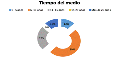El tiempo o la trayectoria que en promedio llevan los medios comunitarios y alternativos y que señalaron los directores de los medios como se muestra en el Gráfico VII, es de 6 a 10 años (50%), este periodo se debe también a un proceso estatal donde a partir de la Resolución 00415 del 13 de abril de 2010, se expide el reglamento del Servicio de Radiodifusión Sonora para otorgar concesiones de prestación del servicio de radiodifusión (Ministerio de Tecnologías de la Información y las Comunicaciones – [MinTIC], 2010).