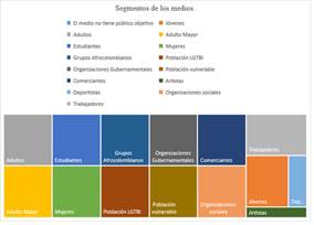 Como se puede observar en el Gráfico I, referente a las audiencias o público objetivo, el segmento de los medios es amplio, de acuerdo con la respuesta de los directores de los medios de comunicación comunitarios y alternativos, quienes conocen toda la programación. Incluye público en general con un 95% de canales que integran: Poblaciones vulneradas, LGTBIQ, campesinos, grupos afrocolombianos, comerciantes, entes estatales, organizaciones sociales, estudiantes, artistas, y deportistas, puesto que las programaciones abren espacios de interés para múltiples colectividades.