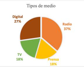 Respectivamente, en un tercer lugar, con el 18% (ver Gráfico II), aparecen la televisión y la prensa. Con relación a la televisión, es reducido el porcentaje, dada la inversión de equipos, infraestructura y tecnología que demanda este tipo de formato. Y en términos de prensa, la impresión es un tema de inversión en el tiraje y la distribución, dado que los directores de estos medios aclaraban que debían tercerizar estos servicios en la capital del Meta, puesto que directamente en sus regiones, no se generaban este tipo de trabajos, lo que aumentaba el costo de manutención.