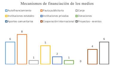 En el punto de financiación, se identifica en la Figura III, que la pauta publicitaria ocupa el primer lugar, este lo utilizan el 100% de los medios. Lo siguen los proyectos, eventos y gestiones con entidades privadas, al igual que participaciones en ferias de la región, fiestas, foros u otros proyectos, que les permiten generar ingresos extra que cubra gastos del medio. Otras acciones mediadas son campañas de salud, medio ambiente y/o sociales. Otras formas de percibir ingresos minoritarios se asocian con canjes (1) de servicios en contraprestación a su gestión o donaciones (1) de organizaciones. (6) medios deben autofinanciarse sacando, en algunas ocasiones, de sus propios recursos para sostenerse.