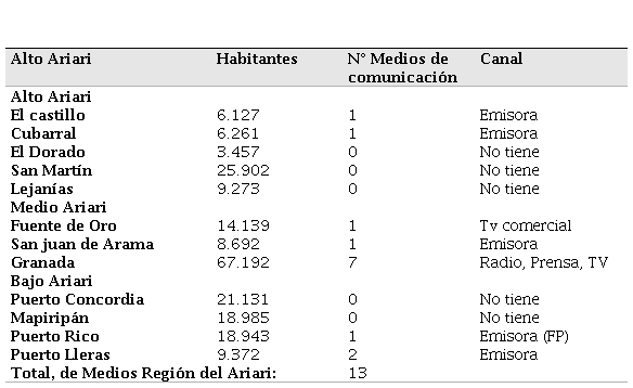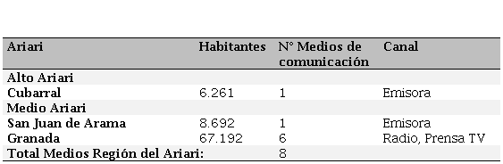 Con relación a la población objeto de estudio, la Fundación Para la Libertad de Prensa en Colombia (FLIP, 2015), señala a través del Mapeo de medios de comunicación (ver Figura I), que en el departamento del Meta existen 50 medios de esta naturaleza y en la región del Ariari, particularmente, se encuentran 13 medios, tal como se presenta en el Cuadro 1, en el cual se relacionan el número de habitantes, la cantidad de medios de comunicación comunitarios y/o alternativos, así como los canales con los que hacen presencia.