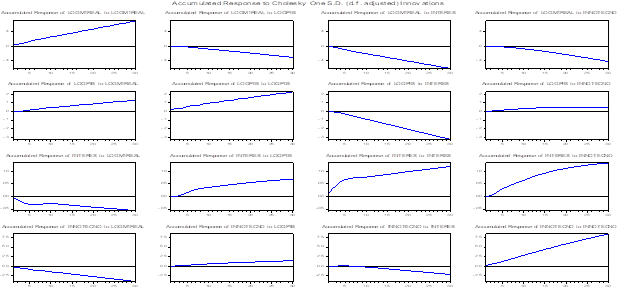 De acuerdo con esto, teniendo en cuenta la resolución de los objetivos para esta investigación, a través de la metodología Cholesky es posible interpretar el impacto o efecto de las innovaciones o choques de cada variable sobre la variable endógena (saldos reales), haciendo que dichas variables respondan de manera inmediata sobre LOGM1REAL en un horizonte temporal.