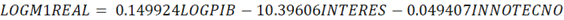 De este modo, al establecer la cointegración en la ecuación LOGM1REAL, LOGPIB, INTERES, INNOTECNO del modelo de demanda transaccional de dinero, tal como se muestra en la Tabla 4, la combinación lineal de las series resulta estacionaria y cointegrada una vez, por lo tanto, existe evidencia plausible para determinar que en el largo plazo cada una de las variables divergen en forma conjunta hacia el equilibrio.