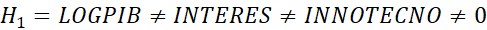 Los resultados en los estadísticos de la prueba de rastreo (trace) y Valor Propio Máximo (Max-Eigen) evidenciados en la Tabla 3, arrojan un vector de cointegración al 5% del nivel de significancia estadística, lo que sugiere que existe evidencia econométrica para afirmar que las series LOGM1REAL, LOGPIB, INTERES, INNOTECNO, están cointegradas una vez, puesto que se mueven conjuntamente a lo largo del tiempo, y las diferencias entre sí son estables, por ende, existe una relación de equilibrio en cointegración estable a largo plazo.