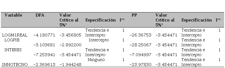; por lo tanto, se rechaza la hipótesis nula de existencia de una raíz unitaria a un nivel de significación del 5%, y la variable que representa los saldos reales es estacionaria e integrada en orden uno I(1). Del mismo modo, a través de la prueba de Phillips-Perron se obtiene que el valor del estadístico PP,