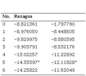 La estimación de los rezagos óptimos que se presenta en la Tabla 2, se hizo a partir de los rezagos automáticos (6) arrojados por Eviews10. Para esto se toma en cuenta el valor que minimice los criterios Akaike y Schwarz, así, el software genera automáticamente a través de un asterisco (*) el valor o valores en el rango mínimo. De este modo, tomando como referencia ambos criterios, Akaike y Schwarz coinciden en que el rezago que minimiza el modelo es cinco (5), de manera que este es el valor con el cual deben estimarse los procedimientos en adelante.