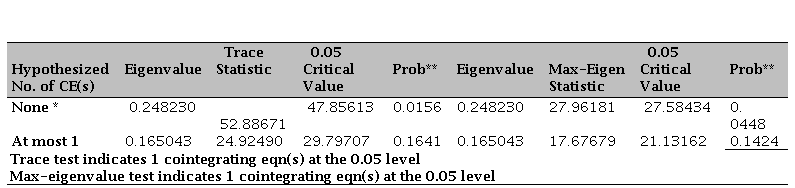 , por lo que se rechaza la hipótesis nula que trata de la existencia de ningún vector cointegrante; en cambio, no se rechaza la hipótesis sobre la existencia de al menos un (1) vector de cointegración, debido a que se cuenta con evidencia econométrica para establecer que existe al menos un (1) vector cointegrante. De la misma manera, de acuerdo con el estadístico de Valor Propio Máximo (Max-Eigen), su valor cae en Importar imagen y a un alfa del 5% su valor es de Importar imagen , por lo que se rechaza la hipótesis nula sobre la existencia de ningún vector cointegrante; en cambio, no se rechaza la hipótesis sobre la existencia de al menos un (1) vector de cointegración puesto que se tiene evidencia econométrica para establecer que existe al menos un (1) vector cointegrante.