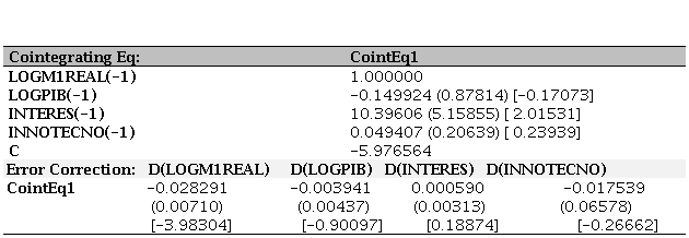 La cual mantiene la relación de largo plazo encontrada bajo la cointegración de Johansen, y corrige los shocks de los errores a corto plazo, por ende, existe evidencia econométrica para indicar que el modelo es estable al corto y largo plazo, además, presenta los signos correctos de acuerdo a la teoría de la preferencia por la liquidez y el modelo de tecnología de transacciones. De manera que, el VEC indica automáticamente (-1) como factor multiplicativo (matriz transpuesta) al resultado de cada una de las variables, y así tras dicha multiplicación o transposición, la serie LOGPIB resulta con signo positivo; la serie INTERES con signo negativo; y así mismo la serie INNOTECNO presenta signo negativo; las cuales se relacionan con la serie LOGM1REAL en valor de uno a uno, de acuerdo al signo que las precede.
