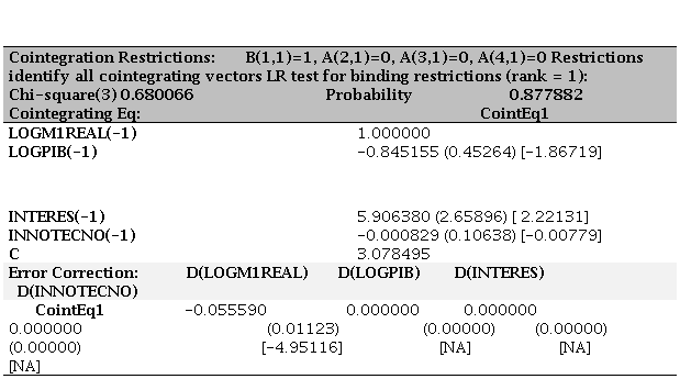 Para este caso, teniendo en cuenta la Tabla 6, se aplican tres restricciones, una por cada variable: LOGPIB, INTERES, INNOTECNO para verificar exogeneidad débil en cada una de ellas; y dejando la variable LOGM1REAL que representa los saldos reales, como endógena. La idea es que, a través de la imposición de restricciones, se pruebe que las series LOGPIB, INTERES, INNOTECNO actúan como débilmente exógenas ante la demanda de saldos reales LOGM1REAL.