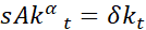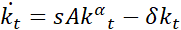 . Según esta ecuación, la tasa de crecimiento del capital por trabajador se eleva cuando la inversión bruta por trabajador, (donde es la propensión al ahorro es una constante, es el acervo de capital por trabajador en el tiempo t y donde α es la contribución del capital en la formación del producto) es mayor que la depreciación por trabajador (donde