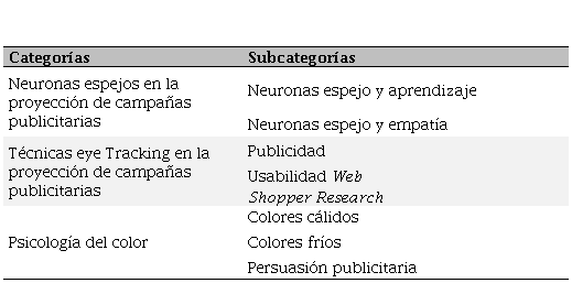 Las categorías que se analizaron estuvieron relacionadas al entorno de la publicidad en los diferentes medios online y offline, así como de las características de establecimiento (ambientación) y la personalidad de la marca. El método inductivo, permitió el análisis detallado de la situación en el contexto de las pequeñas empresas del sector de restaurantes de la ciudad de Huancayo-Perú. A partir de las unidades de análisis, para el caso de los administradores, se plantearon algunas categorías y subcategorías de la recolección de información sobre Neuromarketing en el uso de Campañas Publicitarias para el sector de Restaurantes.