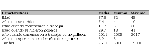 La edad promedio de los entrevistados era de 37,8 años y comenzaron a trabajar como polleros a la edad de 29,7 años. Tenían en promedio 8,2 años de experiencia conduciendo migrantes a Estados Unidos. 13 conducían migrantes hasta Texas, 2 hasta Florida, 1 hasta Alabama, 1 hasta el estado de Washington, y 1 de los entrevistados en 2020 (Octavio), conducía migrantes a Florida y Texas.