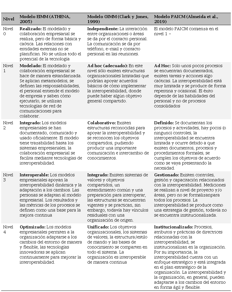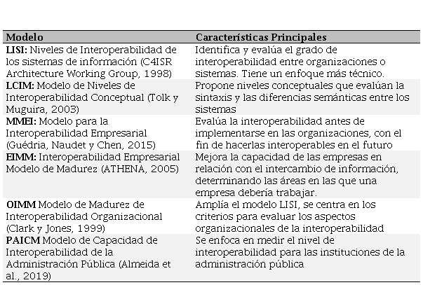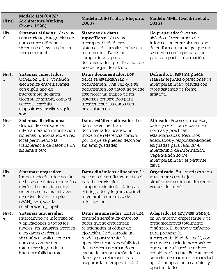 Para la evaluación de la interoperabilidad, los modelos de madurez juegan un papel preponderante puesto que identifican las etapas a través de las cuales los sistemas y organizaciones deben evolucionar o madurar, con el fin de mejorar su capacidad de interoperar (C4ISR Architecture Working Group, 1998; Camara, Ducq y Dupas, 2014). El Cuadro 1, muestra los principales modelos de madurez de interoperabilidad según Leal et al. (2016).