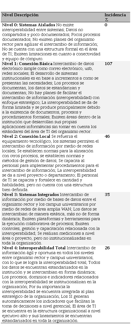 El nivel que ocupa el segundo lugar con mayor número de incidencias corresponde al Nivel 2 Conexión Local, donde su principal característica es que la información es intercambiada a través de redes locales, este nivel cuenta con 46 incidencias; le sigue en el tercer lugar el Nivel 3 Sistemas Integrados con 35, donde se da la interoperabilidad de los SI en diversas áreas de la organización, pero no al nivel institucional, debido a la utilización de redes de área amplia y bases de datos estandarizadas; le sigue el Nivel 4 con 26 incidencias correspondiente a la Interoperabilidad Total, que representa al nivel de madurez que la unidad de análisis debe alcanzar, este escalonamiento debe realizarse en forma gradual. Cabe aclarar que no resultaron incidencias en el Nivel 0 Sistemas Aislados.