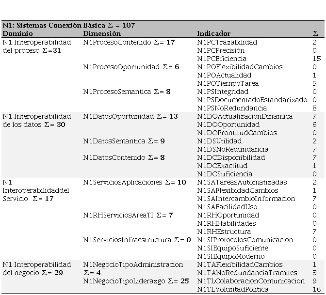 El nivel 1 se refiere a una interoperabilidad básica, el análisis a nivel dominio/dimensión/indicador con incidencias mayores a 5 se detalla a continuación: